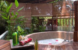 Treat yourself to the Japanese mineral bath or an exotically artsy Mood Mud Massage. Guests are guided along stone lined pathways to a large palm-thatched treatment room in the middle of the tropical rainforest; jungle noises are the sounds to be heard during your massage, which can include to be painted in different muds.