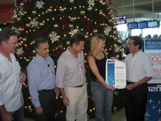 This morning, served 12 million passengers this year at Cancun Airport, received recognition at a ceremony in which the Secretary of Tourism of Quintana Roo, Carlos Joaquin Gonzalez, Director of the Cancun airport, Ing Gabriel Gurméndez and Commercial Director of ASUR, Manuel Gutierrez Sola.
