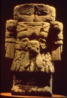 Coatlicue Mother of Gods As you travel along Kukulcan Boulevard, you will notice a series of monuments set against a backdrop of palm trees and tropical shrubs. These are faithful reproductions of ancient statues, found in various archeological sites throughout Mexico and the Mayan World, reflecting the enormous cultural heritage while enhancing the beauty of the Hotel Zone. Standing 2.57 meters tall, the original statue of Coatlicue, the Aztec goddess of both the heavens and the underworld, dominates everything around her. She gave birth to the gods and to humankind but, as she frequently ate her progeny, Coatlicue was regarded as both the great creator and destroyer of life. In the statue, Coatlicue´s head has been cut off and instead are two serpent´s head, symbolizing the flowing of blood. Around the goddess´ neck is a necklace of human hands and hearts with a skull pendant in the middle. Her hands and feet feature claws, as a symbol of her thirst of human blood and the brutality of her nature. Coatlicue´s torso is covered with human skin and her skirt is made from writhing snakes. Coatlicue originally stood on the Great Temple in the Aztec city of Tenochtitlan. The statue was buried by the Spaniards, who found this terrifying.