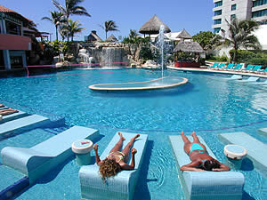 Hyatt Regency Cancun The beautiful renovated Hyatt Regency Cancun could easily paraphrase the old movie title “A Room with a View” to reflect the ambiance at its lobby-level The lounge and Terraces bar, calling it “A Drink with a View”. The is because of the extraordinary view of the Caribbean Sea from both the interior section of this bar as well as the multi-level terraces that completes its configuration. Its attractive minimalist décor contributes to the enjoyment of the refreshing, latino cocktails by day and night. Comfortable lounge-like chairs both in the Lounge and on the lower two levels of the terraces and beds suitable for two or more persons on the upper terrace level contribute to the sense of intimacy created by the Lounge & Terraces. This bar, just steps away from the main lobby of the hotel, offers delicious latino drinks as well as 50 different tequilas from which to choose. Add to that Arab-style hors d’oeuvres to go along with your drinks and you have the perfect recipe for a romantic experience with your significant other or the chance to enjoy pleasant conversation among friends. The Lounge & Terrace bar at the Hyatt Regency Cancun is a great place to spend the afternoon or evening.